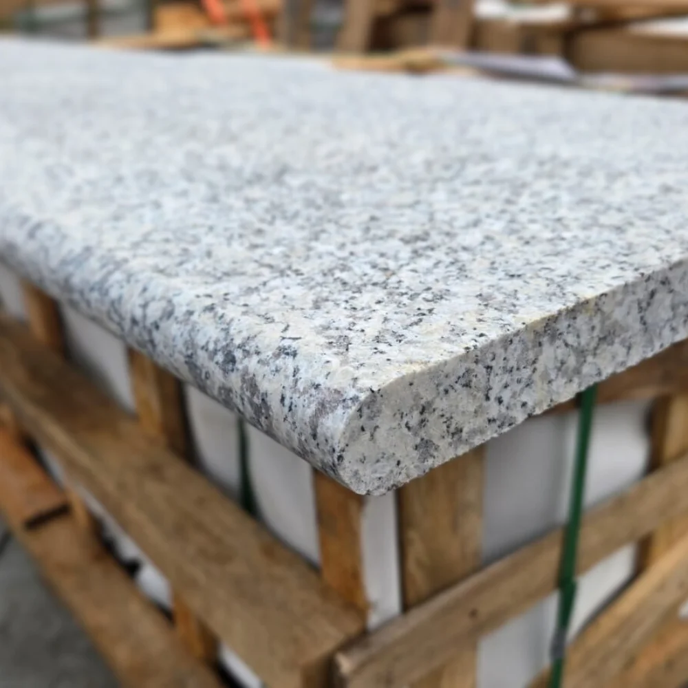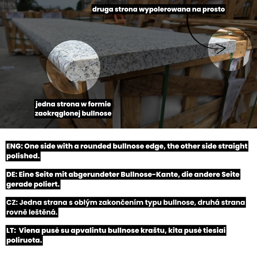 Co więcej, krawędzie stopnia zostały precyzyjnie opracowane – jedna strona tworzy łagodne zaokrąglenie (bullnose), podczas gdy druga pozostaje starannie wypolerowana, co podkreśla jego elegancję i rozszerza możliwości zastosowania, przykładowo jako obramowanie murków.