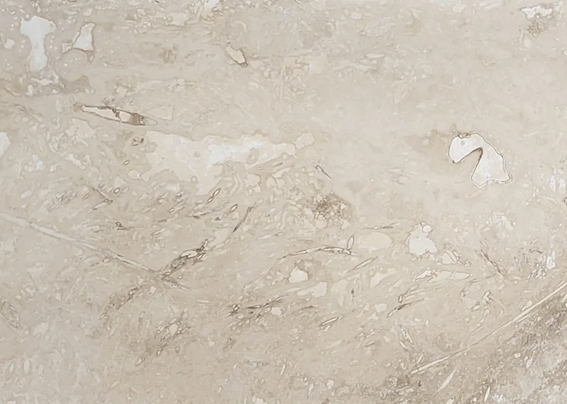 Elegancki Trawertyn 12mm Bianco Classic Cross Cut Filled&Honed 40,6x61x1,2 cm. Naturalny kamień z wypełnioną i polerowaną powierzchnią. Idealna do podłóg i ścian.