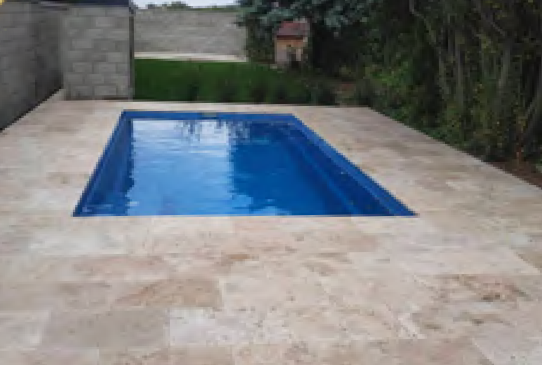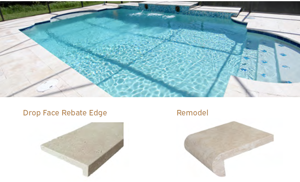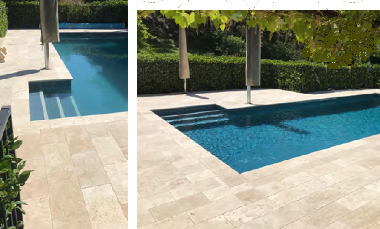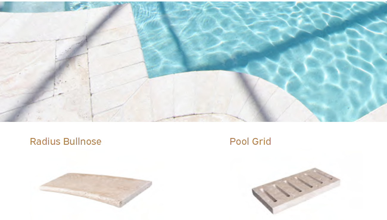 Elementy brzegowe do basenu, kamienne wykonane z trawertynu Classic mix.