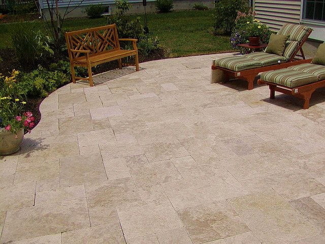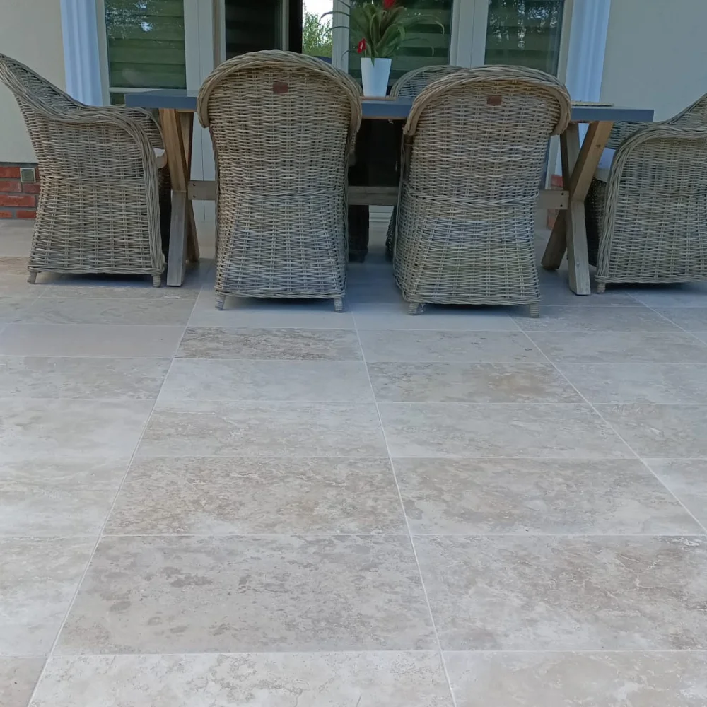 Eleganckie płyty z naturalnego trawertynu w delikatnym, beżowym odcieniu – Twoje idealne rozwiązanie na tętniącą życiem strefę relaksu na świeżym powietrzu!