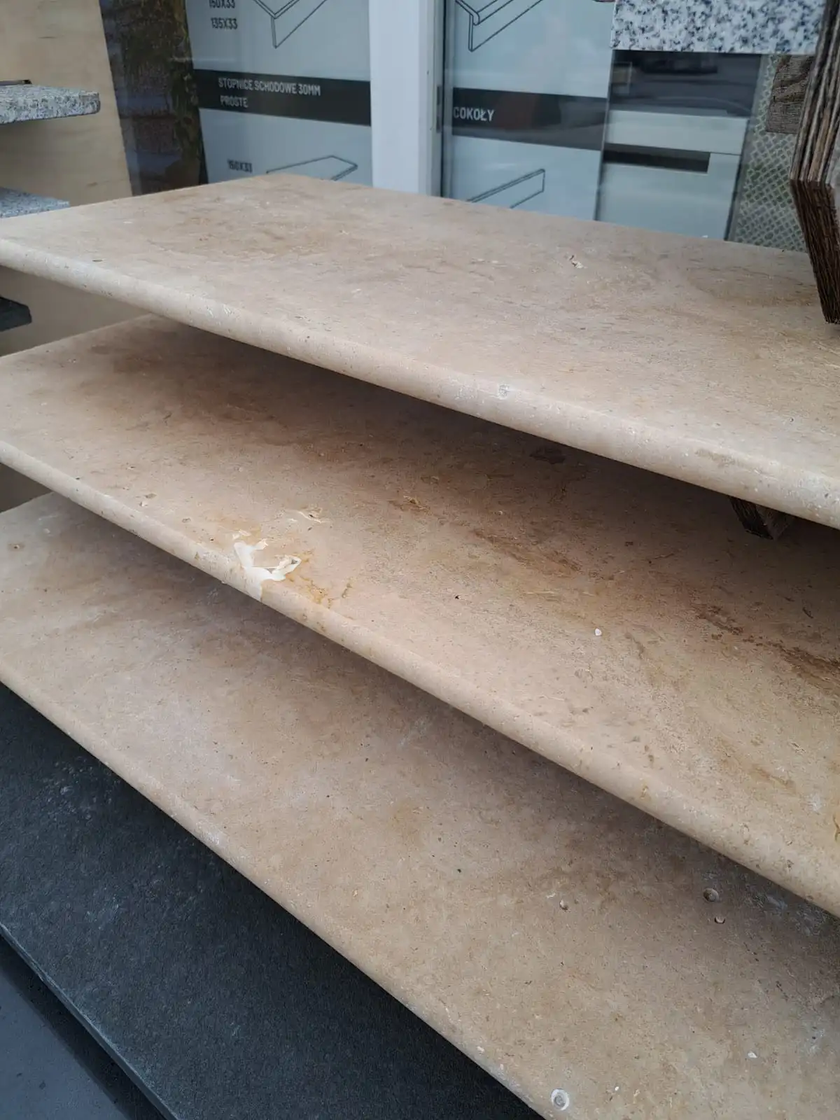 Stopnie schodowe z kamienia naturalnego w klasycznej mieszance trawertynu.